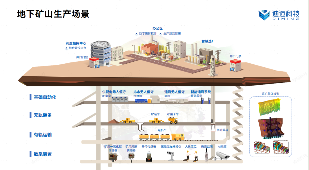面對礦業高質量發展的新要求,迪邁科技堅持以技術創新為核心,圍繞礦山生產全生命周期,構建了覆蓋“資源掌握—安全生產—無人作業—智慧運營”的完整產品與技術體系,為露天礦與地下礦提供一體化、場景化、可落地的整體解決方案。在資源協同、生產調度、智能無人開采、安全管控等關鍵領域,已形成成熟技術路線和豐富工程經驗,并在多座大型礦山實現規模化應用,顯著提升礦山本質安全水平和整體運營效率。