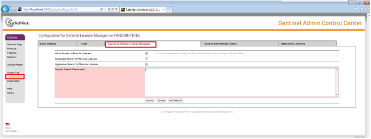 (3)在頁(yè)面左側(cè)選擇“Configuration”項(xiàng),切換至“Access to Remote License Managers”選項(xiàng)卡,在“Specify Search Parameters”項(xiàng)輸入主機(jī)IP地址,如下圖所示。輸入完成后點(diǎn)擊“submit”進(jìn)行提交。